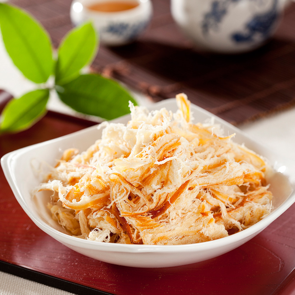 煙燻魷魚絲:嚴選新鮮魷魚、蔗糖、鹽、味精、己二烯酸(0.1%以下)170g ± 10g