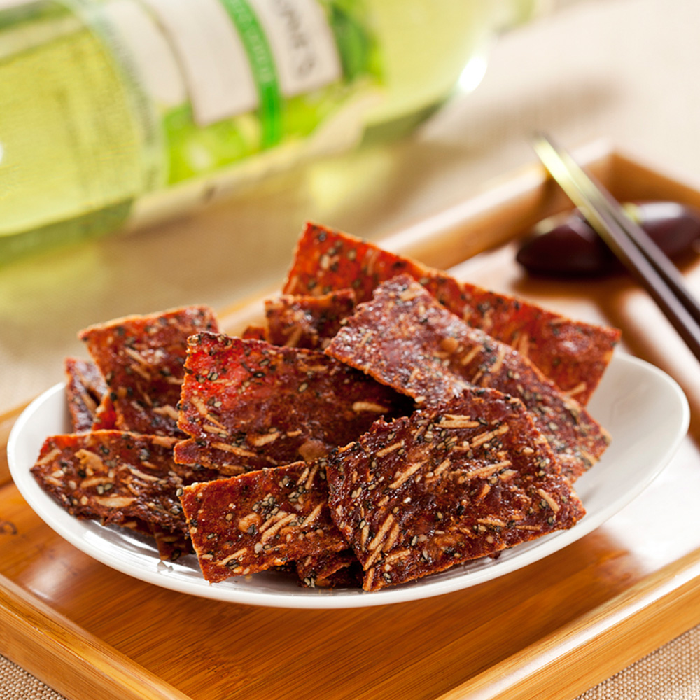 芝麻杏仁厚脆:嚴選CAS豬肉、醬油、蔗糖、鹽、杏仁、黑芝麻、天然香辛料、己二烯酸(千分之二以下)、法定食用色素(紅色6號) 170g ± 10g